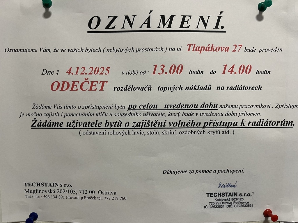 Oznamujeme Vám, že ve vašich bytech na ul. Tlapákova 27 bude proveden